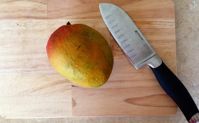 Step 1: Grab your knife, cutting board, spoon and wash your mango.